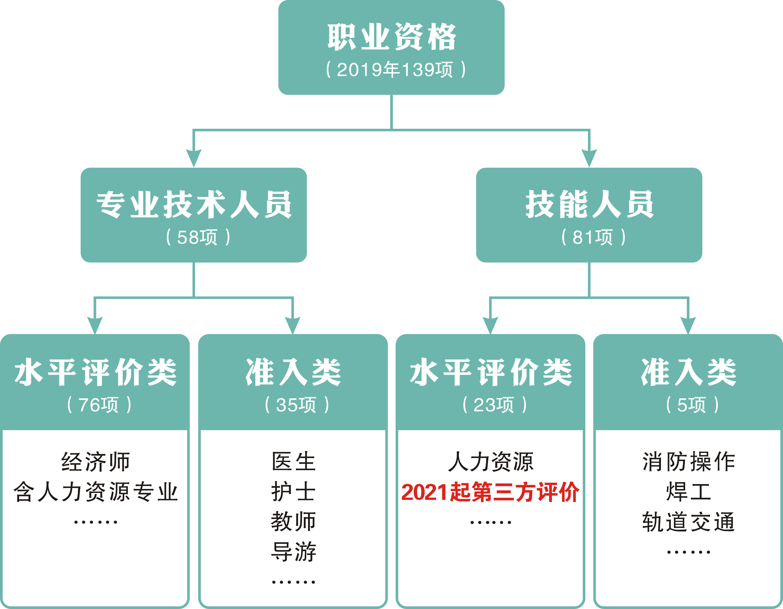 2017年9月12日,人社部发布《关于公布国家职业资格目录的通知》。文件将职业资格重新分为专业技术人员职业资格和技能人员职业资格。2019年12月30日,国务院总理李克强主持召开国务院常务会议,决定分步取消水平评价类技能人员职业资格,推行社会化职业技能等级认定。为了推动该项工作进程,人社部于2020年7月10日发布了《关于对水平评价类技能人员职业资格退出目录有关安排进行公示的公告》企业人力资源管理师退出国家职业资格水平评价目录改为第三方社会化职业技能等级认定。2021年1月26日,人社部官网发布《人力资源和社会保障部办公厅关于2021年度专业技术人员职业资格考试工作计划及有关事项的通知》。